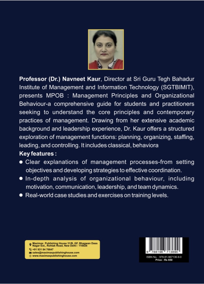 Professor (Dr.) Navneet Kaur, Director at Shri Guru Tegh Bahadur Institute of Management and Information Technology (SGTBIMIT), presents MPOB : Management Principles and Organization Behavior – a comprehensive guide for students and practitioners seeking to understand the core principles and contemporary practices of management. Drawing from her extensive academic background and leadership experience, Dr. Kaur offers a structured exploration of management functions : planning, organizing, staffing, leading and controlling.